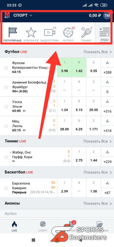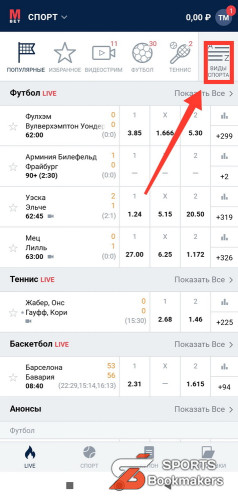 1. На главной странице экрана нажмите на вкладку «Виды спорта»;