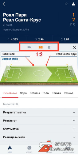 Все остальные могут наблюдать за матчем с помощью инфографики. Это панель, которая графически демонстрирует все важные моменты игры. Открыть её можно нажатием на иконку «футбольное поле».
