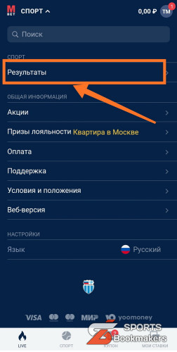Посмотреть результаты прошедших встреч бетторы могут в разделе «Спорт». Для этого нужно перейти в меню «Результаты». Классификация удобная, каждый матч разбит по категориям «Лига / команды участников / дата игры».